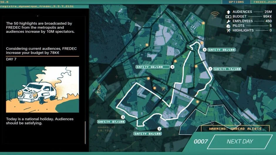Un court jeu narratif expérimentant le genre de la simulation de gestion. Avril 2131. Dans la campagne abandonnée, des voitures de rallye s’affrontent sans relâche pour divertir le public, loin de la capitale. Recrutez, filmez, gérez les courses pour qu’elles se déroulent aussi bien et de manière spectaculaire que possible. Tout devrait bien se passer, tant que vous gardez le contrôle…